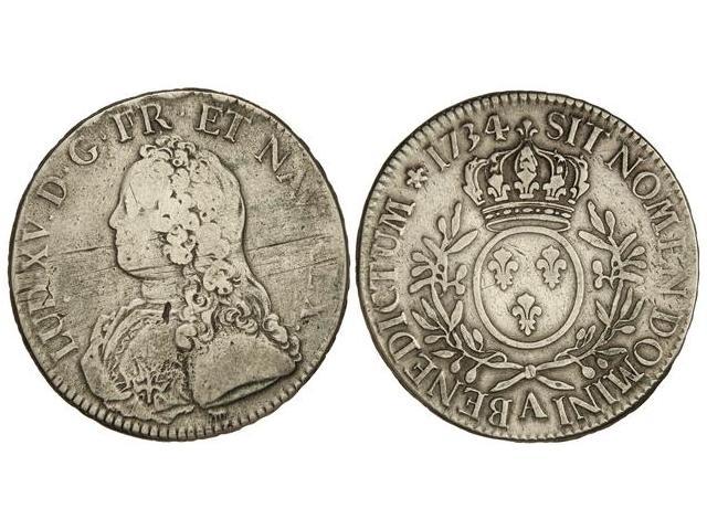 1 Ecu. 1734-A. LUIS XV. PARÍS. AR. (Rayas y golpecitos). C-42.1. MBC-.