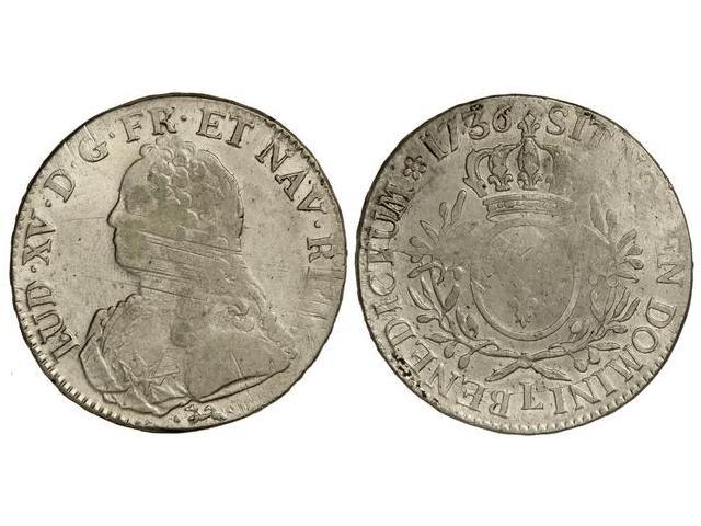1 Ecu. 1736-L. LUIS XV. BAYONA. AR. (Múltiples rayas de ajuste y golpecitos). CC-42.13. BC+.