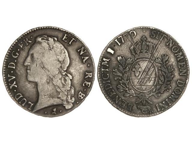 1 Ecu. 1770. LUIS XV. PAU. Ceca: buey. AR. (Rayas de ajuste). KM-518. BC+.