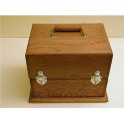 <b>Description: </b>cylinder turns oak case, crack in top, no crank, mechanism intact 12 1/4" x 9" x 9 1/4" h
