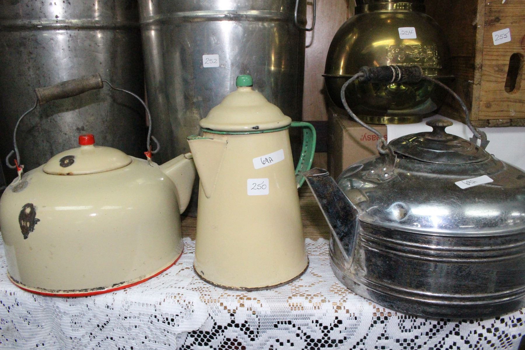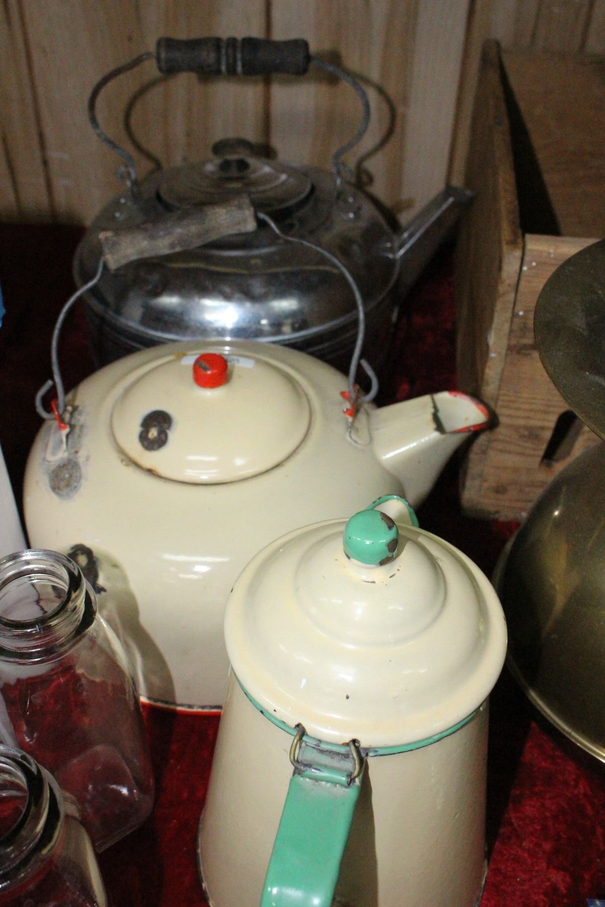 1 Enamal, 1 Metal Kettle and 1 Enamel Coffee Pot