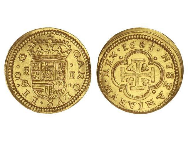 1 Escudo. 1683. SEGOVIA. B.R. Brillo original. Excepcional ejemplar. (En la colección Caballero de las Yndias había un ejemplar de las denominaciones de 2, 4 y 8 Escudos pero no la de 1 Escudo). RARÍSIMA. Cal-197. SC-/EBC