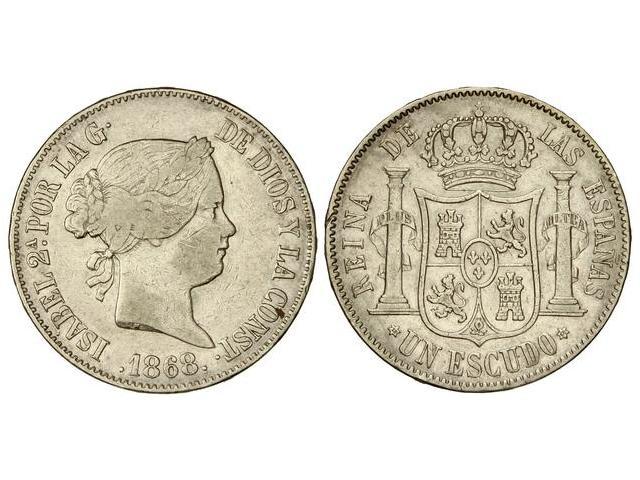 1 Escudo. 1868 (*18-68). MADRID. (Golpecitos en anverso). Cal-254. MBC-/MBC.