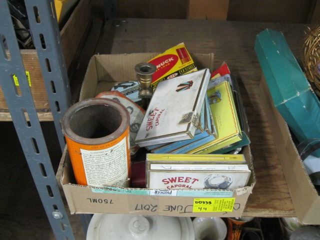 1 FLAT WITH CIGARETTE TINS, GIANT LIGHTER, ETC
