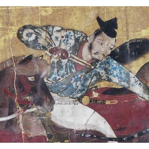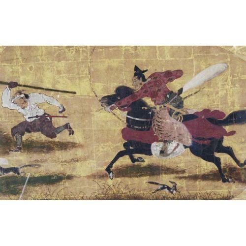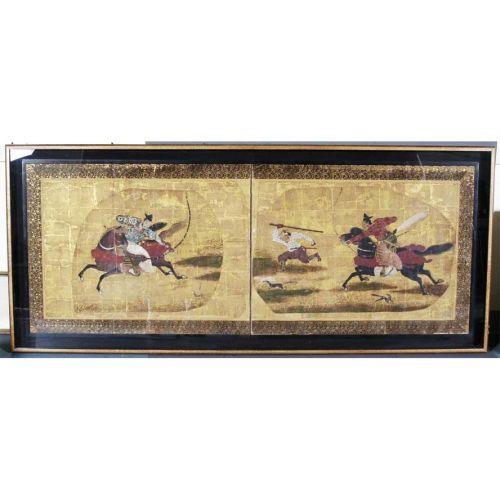 1 FRAMED JAPANESE SCREEN<BR>with painted hunting scene<BR>the screen 27"x68"<BR>19th century <BR>CONDITION REPORT: scratches and surface wear.<BR>PACKING AND SHIPPING - see recommended.