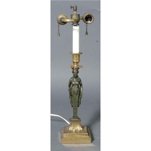 1 FRENCH BRONZE FIGURAL CANDLESTICK LAMP 17" high overall circa 1900 PACKING AND SHIPPING (excluding insurance) by Fairfield Auction to points within the Continental U.S.A.  (international must be handled by 3rd party shipper) $40.  CONDITION REPORT: excellent