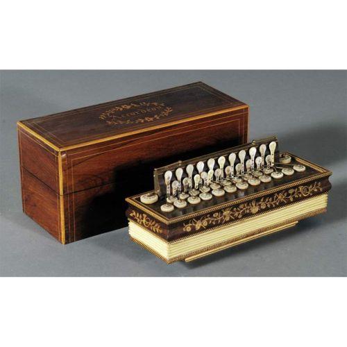 1 FRENCH CASED ROSEWOOD<BR>ACCORDIAN, 13" long<BR>mid-19th century<BR>CONDITION REPORT: small veneer repairs to front corners of the case. <BR>PACKING AND SHIPPING (excluding insurance) by Fairfield Auction to points within the Continental U.S.A. (all international shipments must be handled by 3rd party shipper) $40.