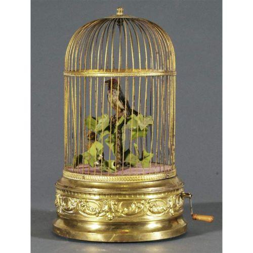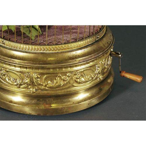 1 FRENCH DOUBLE SINGING BIRD<BR>AUTOMATON<BR>18" high, with two birds<BR>top ring handle replaced<BR>circa 1900 <BR>CONDITION REPORT: works intermittently, ring at top replaced with a threaded cap.<BR>PACKING AND SHIPPING (excluding insurance) by Fairfield Auction to points within the Continental U.S.A.  (all other international must be handled by 3rd party shipper) $40.