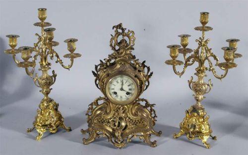 1 FRENCH GILT METAL 3 PIECE CLOCK SET, clock 15" high, circa 1900, CONDITION: finish inconsistancy, some wear, not running, no key, PACKING AND SHIPPING (excluding insurance) AVAILABLE WITHIN CONTINENTAL U.S. BY FAIRFIELD AUCTION FOR $80 . BUYER MAY ALSO PICK-UP OR USE A 3RD PARTY FOR PACKING AND SHIPPING