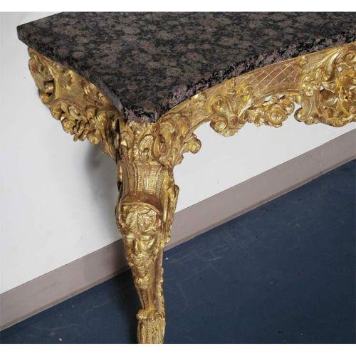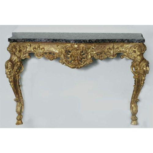 1 FRENCH LOUIS XIV STYLE<BR>GILTWOOD CONSOLE<BR>with marble top<BR>46"x 16"x 30"<BR>late 19th century <BR>CONDITION REPORT: re-gilt and marble replaced.<BR>PACKING AND SHIPPING -see recommended.