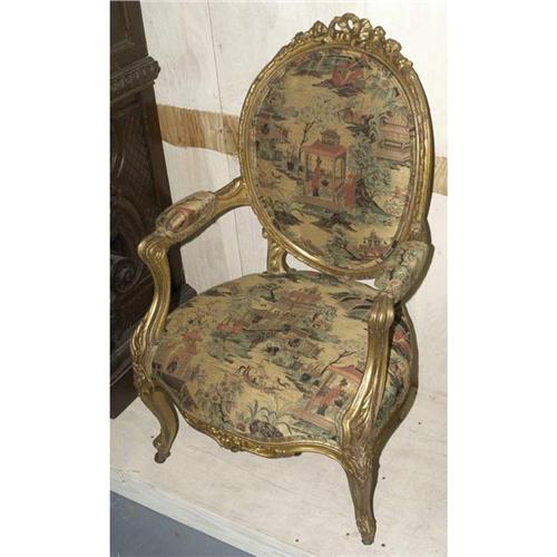 1 FRENCH STYLE GILTWOOD ARMCHAIR circa 1900 PACKING AND SHIPPING must be handled by 3rd party shipper. CONDITION REPORT: excellent with some paint loss and wear.