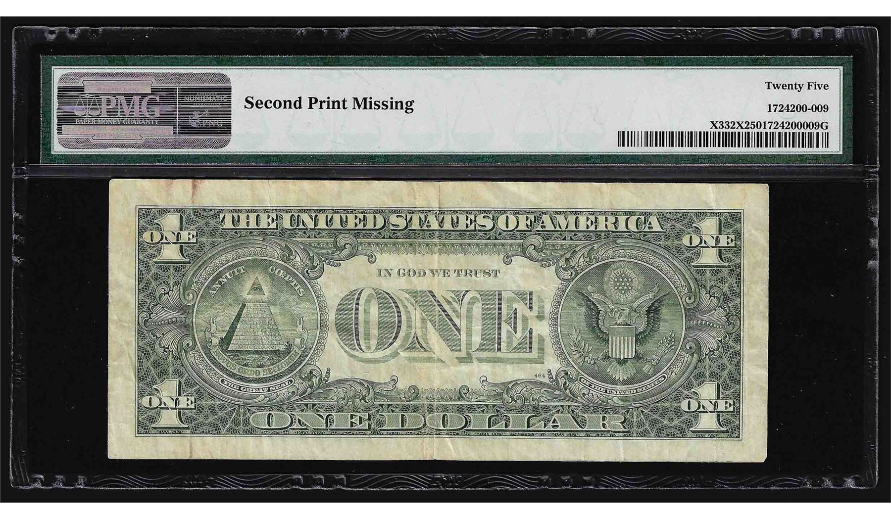 One $1 Federal Reserve Note ERROR Missing Second Print PMG Very Fine 25. PMG Certified.