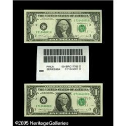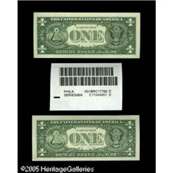 <B>$1 Federal Reserve Note Label Sets 1988A, 1993, 1995. 168 Examples. About Uncirculated or Better.</B></I><BR>The late 1980s saw the labels redesigned with bar codes added. Also, a "brick" of 4000 notes now consisted of four groupings of 1000 notes and each grouping was individually shrink-wrapped with a label attached that listed the first note in the grouping. So, presently a label set consists of the label and the first and last note for that particular grouping of 1000 notes. This first and/or last note can sometimes be a star note and at least a couple of those situations arise in this lot of 168 label sets. It is common to see edge handling on the notes that make up label sets.<BR> 336 notes Lot:16712