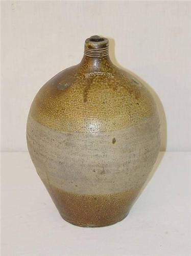 1 GAL. BOSTON OVOID JUG W/ TOOLED COLLAR - IMPERFECTIONS IN MAKING & DRILLED HOLE IN BACK FOR LAMP;