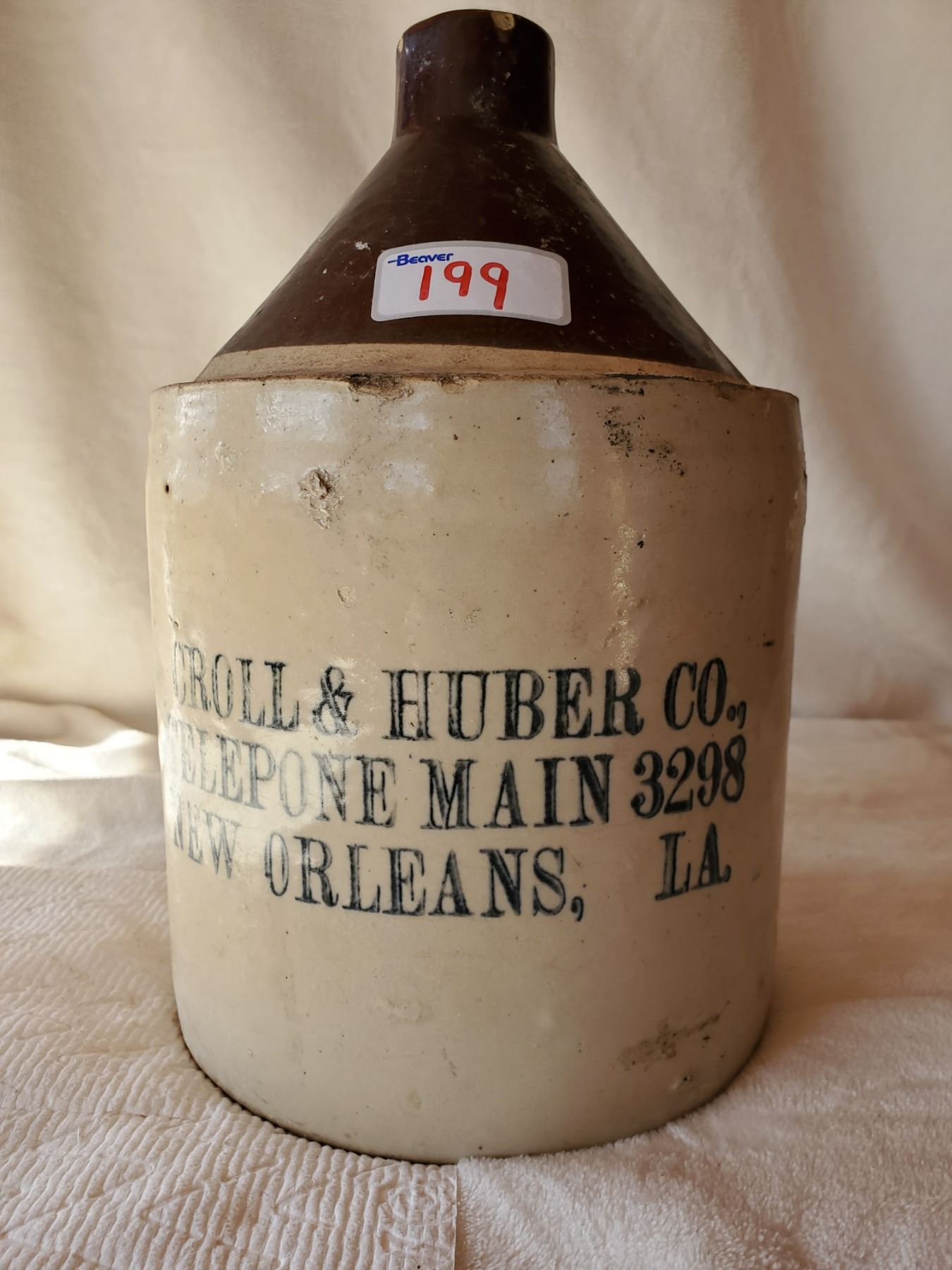 1 GAL. FUNNEL TOP NEW ORLEANS LIQUOR JUG, NO CRACKS (3 TINY SPOUT CHIPS)