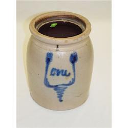 1 GAL. STORAGE CROCK W/ COBALT TORNADO & SCRIPT ONE, TOP RIM CHIPS