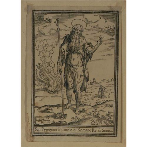 1 GASPAR RUINA (15TH CENTURY, ITALY) San Peregrino 9 3/4"x 6 5/8" woodcut on handmade paper with watermark, mounted to a backing paper PACKING AND SHIPPING (excluding insurance) by Fairfield Auction to points within the Continental U.S.A. (international must be handled by 3rd party shipper) $30. CONDITION REPORT: toned, stains, glued top two corners to board and the glue stain is visible through the front.