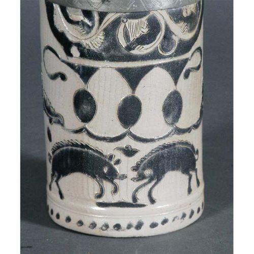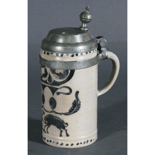 1 GERMAN INCISED STONEWARE STEIN<BR>10" high, 18th century<BR>with pewter collar supporting<BR>hairline at rim <BR>CONDITION REPORT: hairline, pings<BR>PACKING AND SHIPPING - $30 excluding insurance within the Continental USA only (International shipping through 3rd party shipper. We recommend the Newtown UPS Store.)