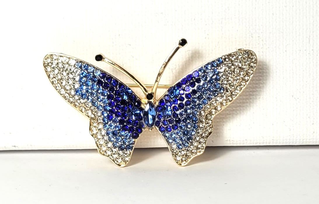 DEEP SAPPHIRE TO CLEAR CRYSTAL BUTTERFLY BROOCH, 2" X 1.75"  JEWELERY