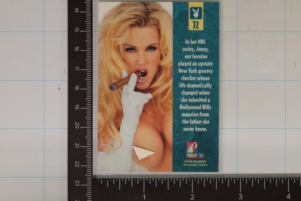 ADULT THEMED PLAYBOY LAMINATED CARD #72, SHE IS FULLY NUDE ON THE FRONT SIDE AND TOPLESS ON THE BACK SIDE. WE COVERED THE AREAS WITH SMALL PAPER SO WE DON'T VIOLATE THE SITES POLICY, BUT WE ASSURE YOU FULLY NUDE