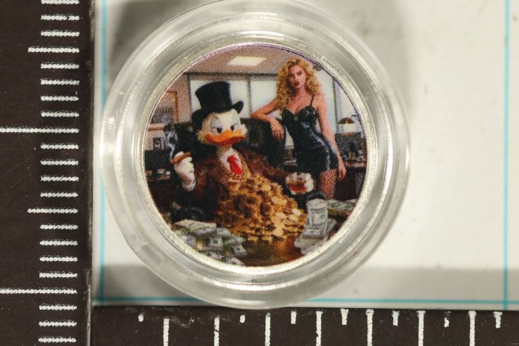 WITH WOMEN IN BLACK DRESS ROUND. IN HARD PLASTIC CAPSULE