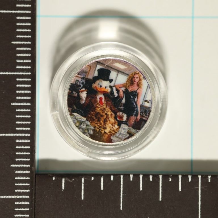 WITH WOMEN IN BLACK DRESS ROUND. IN HARD PLASTIC CAPSULE