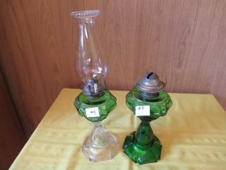 1 GREEN/CLEAR & 1 GREEN BEADED QUEEN HEART OIL LAMPS & 1 CHIMNEY