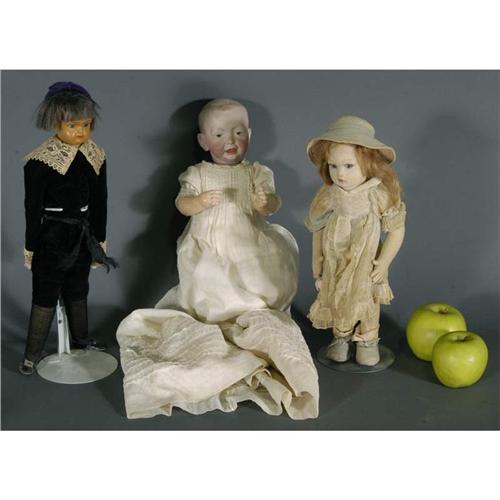 1 GROUP OF 3 DOLLS incl. comp, bisque and felt PACKING AND SHIPPING (excluding insurance) by Fairfield Auction to points within the Continental U.S.A. (international must be handled by 3rd party shipper) $40. CONDITION REPORT: felt doll with some holes and stains.