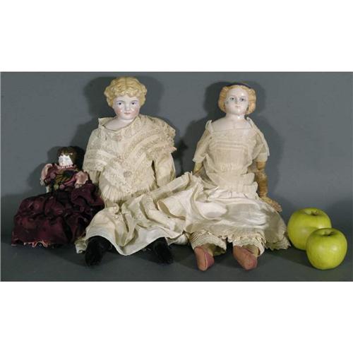 1 GROUP OF 3 DOLLS two china, one compt PACKING AND SHIPPING (excluding insurance) by Fairfield Auction to points within the Continental U.S.A. (international must be handled by 3rd party shipper) $40. CONDITION REPORT: comp with cracks to head, china with 2 small hairlines at shoulder.