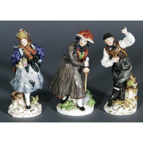 1 GROUP OF 3 MEISSEN FIGURES<BR>the tallest 6" high <BR>CONDITION REPORT: man: missing thumb, part of tie and part of green leaves, extended foot has been broken off and crudly reglued. Flower Lady: missing approximately 1/4" of ribbon, missing tips of ribbon, chipping to flowers, chipping to tip of hat. Other Lady is excellent. <BR>PACKING AND SHIPPING -$40 excluding insurance within the Continental USA only.