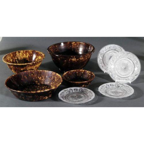 1 GROUP OF 4 ROCKINGHAM BOWLS<BR>together with 4 SANDWICH GLASS<BR>PLATES