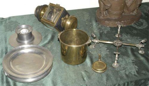 1 GROUP OF METALWARE, including lantern, plated trivet, brass wine cooler, pewter warming dish, CONDITION: excellent, no damage or repairs. PACKING AND SHIPPING BY FAIRFIELD AUCTION WITHIN CONTINENTAL USA (excluding insurance) $35
