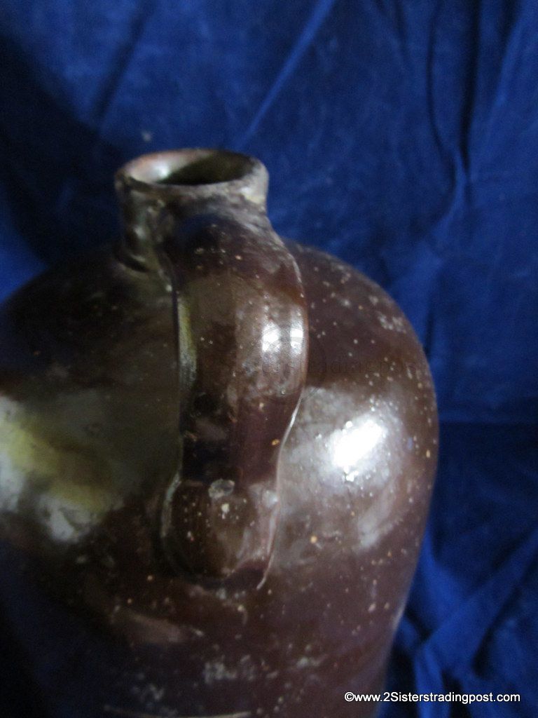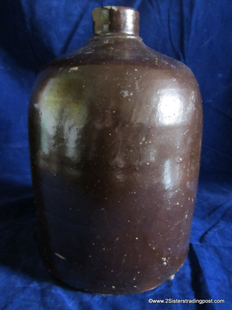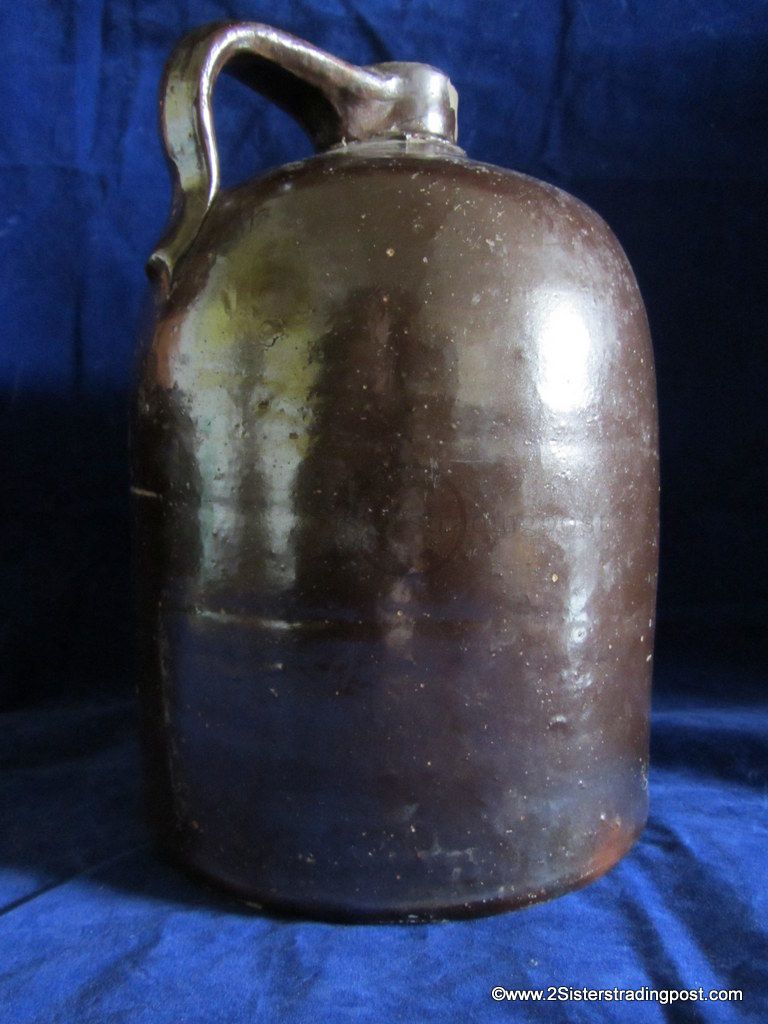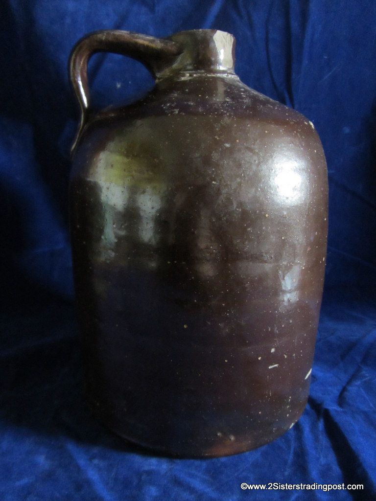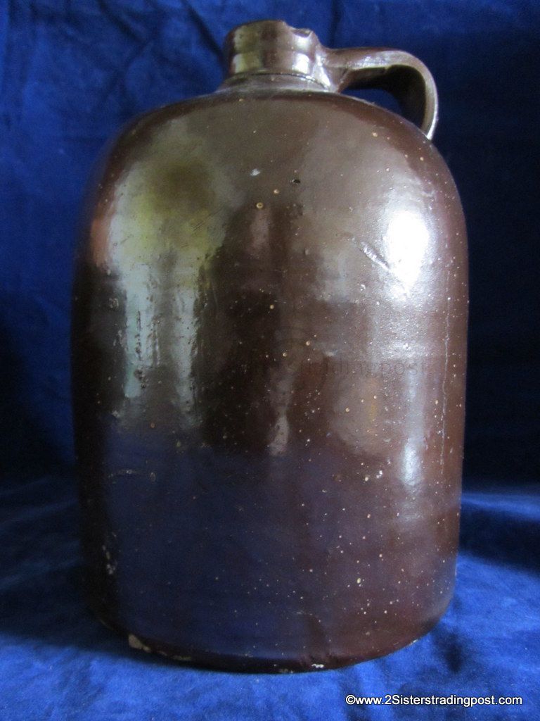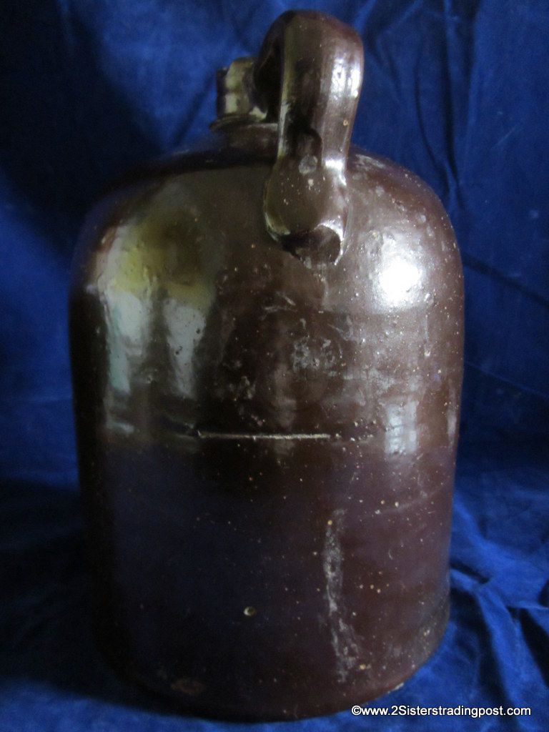 1 gallon beverage jug. The jug has a brown glazing and is a rounded beehive shape, with a single handle. Measures 10.5" tall 7" across the bottom NOTE: there are no makers marks and no stopper. Came from an Estate in Indiana. SHIPPING: Available