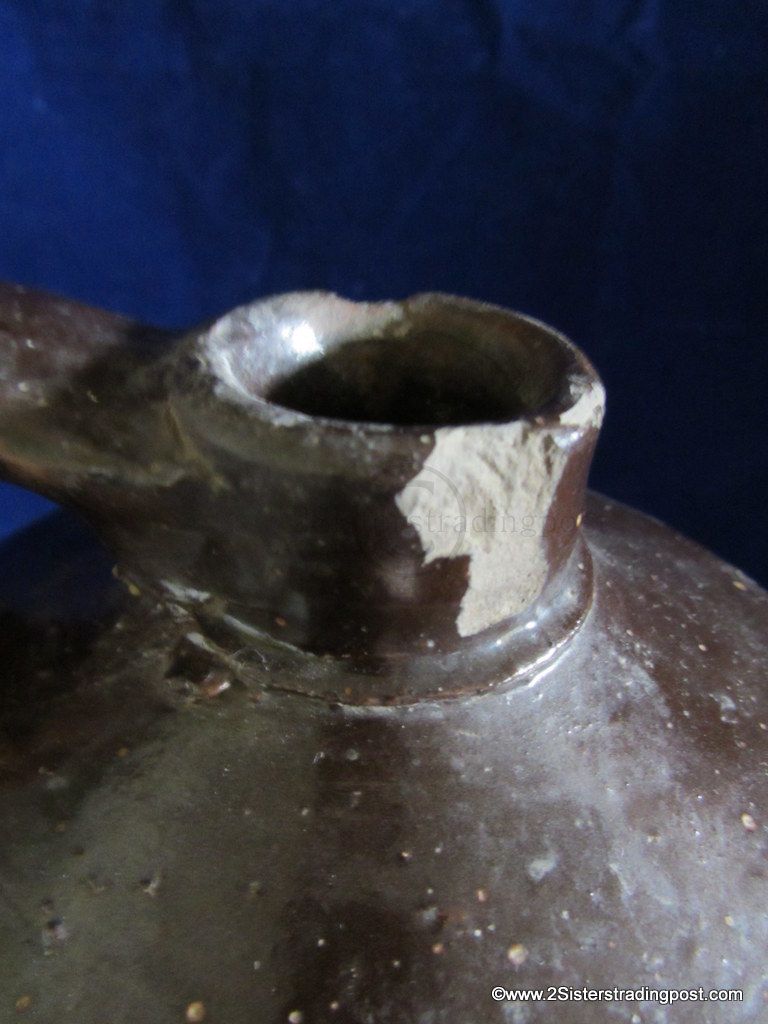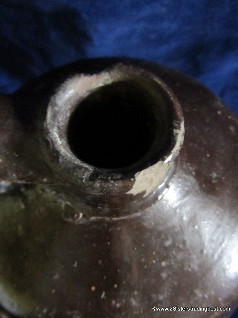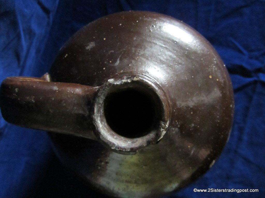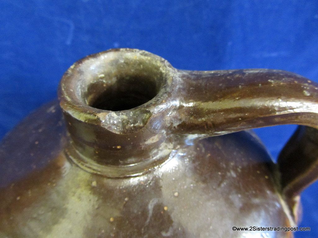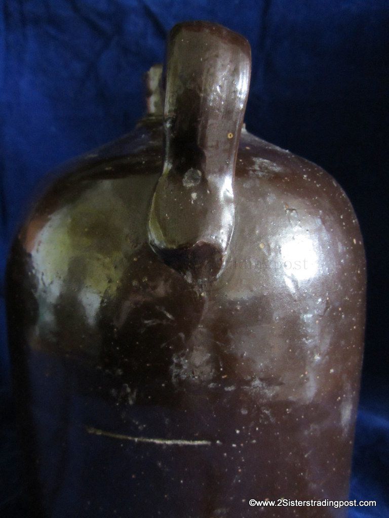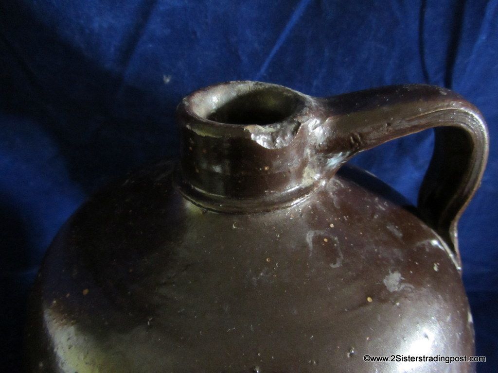1 gallon beverage jug. The jug has a brown glazing and is a rounded beehive shape, with a single handle. Measures 10.5" tall 7" across the bottom NOTE: there are no makers marks and no stopper. Came from an Estate in Indiana. SHIPPING: Available