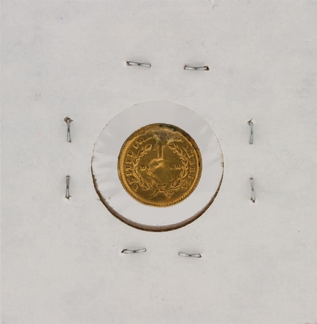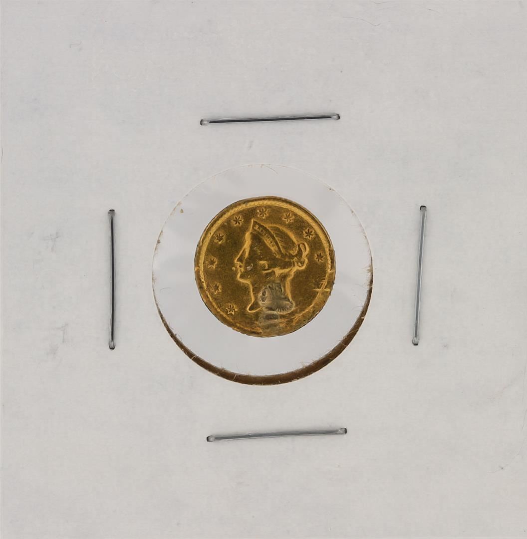 One $1 Gold Coin. The coin is in poor condition and the date can not be read.
