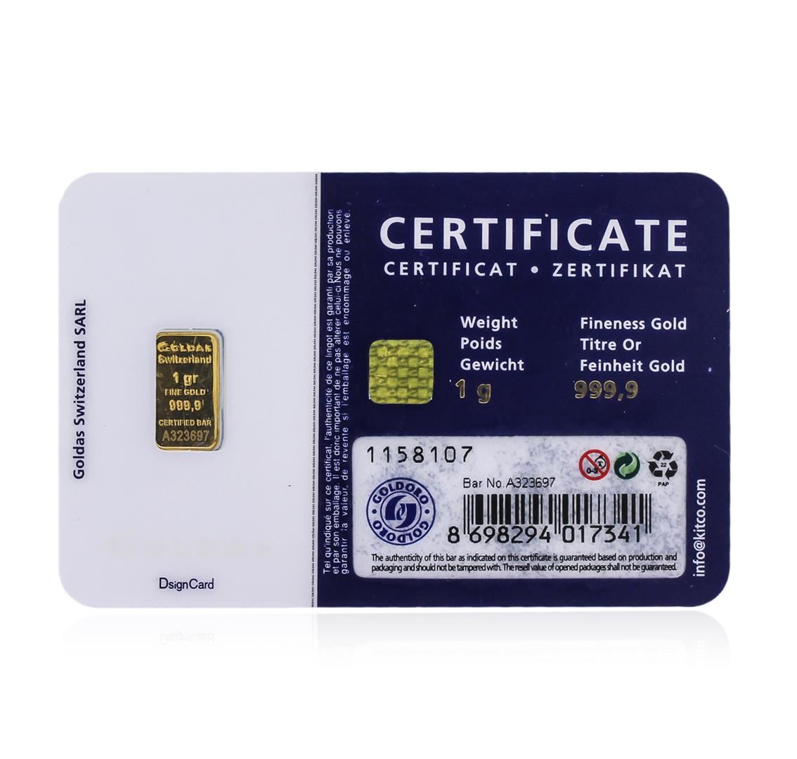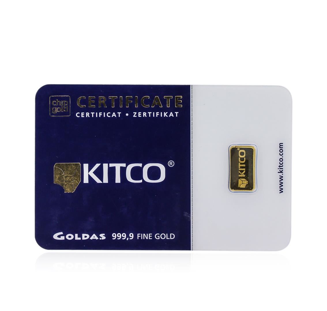 One 1 Gram Gold Bar - KITCO Certified 999.9 Fine Gold.