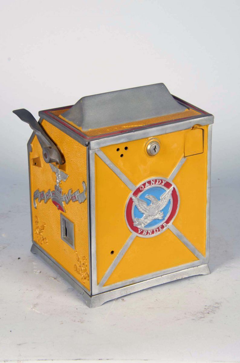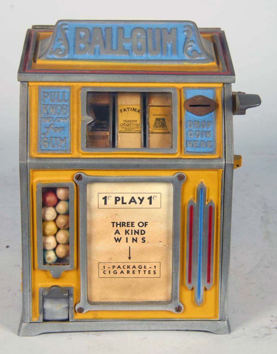 3-Reel cigarette machine w/ gumball vendor c1930s Condition Near Mint Size 8-1/2" x 8-1/2" x 11-3/4"