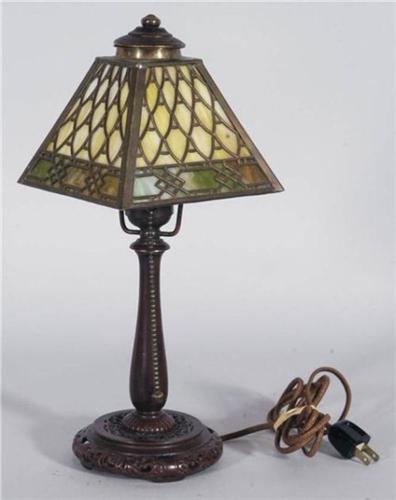 1 HANDEL BOUDOIR LAMP, with lattice overlay, shade signed, 14" high, shade is associated (not original to this lamp), patina does not match, but is Handel, CONDITION: very good, modest wear to patina, no damage or restoration, PACKING AND SHIPPING (excluding insurance) AVAILABLE WITHIN CONTINENTAL U.S. BY FAIRFIELD AUCTION FOR $40 . BUYER MAY ALSO PICK-UP OR USE A 3RD PARTY FOR PACKING AND SHIPPING