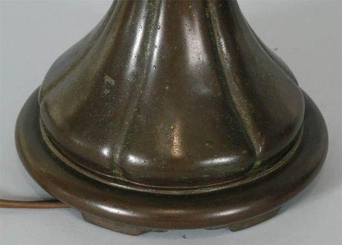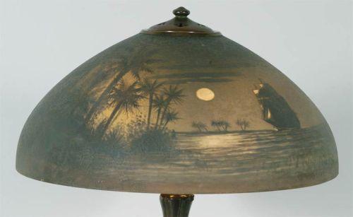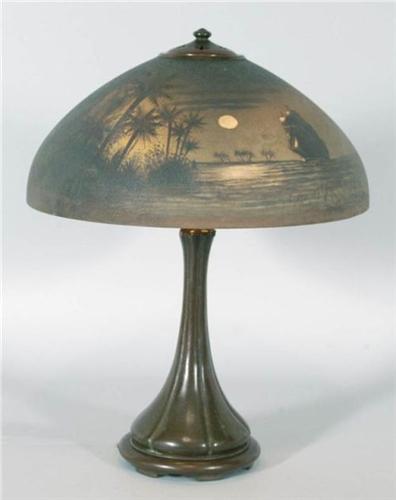1 HANDEL "TREASURE ISLAND" TABLE LAMP with 17 1/2" reverse painted glass shade, 23" high, CONDITION: Shade free of cracks and chips- no defects found. Base with excellent original patina- no damage or restoration. Rewired, but with original sockets. PACKING AND SHIPPING BY 3RD PARTY ONLY - SEE RECOMMENDED SHIPPERS