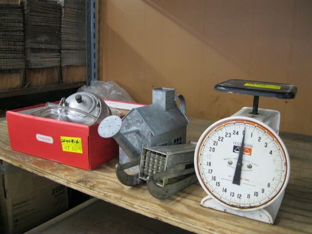 1 HANSEN TABLE SCALE, FRENCH FRY MAKER, AND BOX OF GLASS COOKWARE