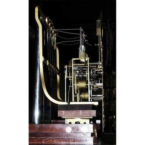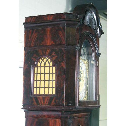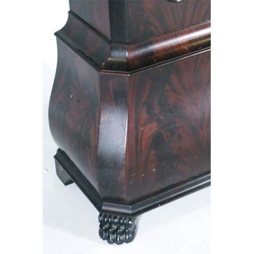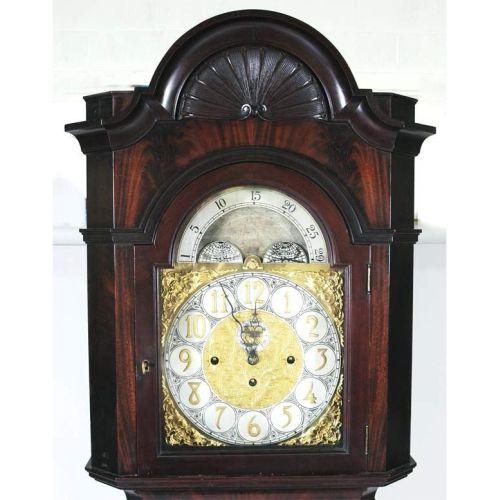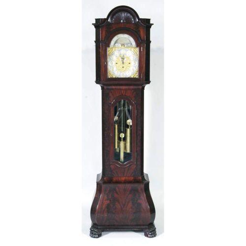 1 HERCHEDES ROCOCO REVIVAL TALL<BR>CLOCK<BR>chiming on five tubes<BR>with moon phase<BR>8'1" high<BR>circa 1910 <BR>CONDITION REPORT: excellent with a veneer crack running up front left side of base, mechanically excellent.<BR>PACKING AND SHIPPING -see recommended.