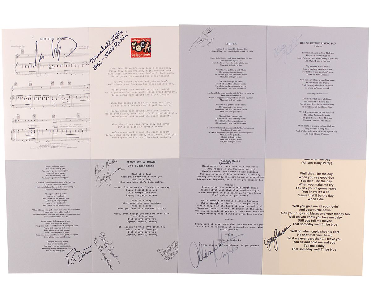 Eight printed 8.5 x 11 souvenir lyrics sheets of #1 hits, each signed by the artist. Signers are: Alannah Myles (‘Black Velvet’), Jerry Allison (‘That’ll Be the Day’), Ian Lloyd (‘Brother Louie’), Carl Giammarese, Dennis Miccolis, and Marty Grebb of The Buckinghams (‘Kind of a Drag’), Ron Dante (‘Sugar Sugar’), Tommy Roe (‘Sheila’), Hilton Valentine (‘House of the Rising Sun’), and Marshall Lytle (‘Rock Around the Clock’). In fine condition.