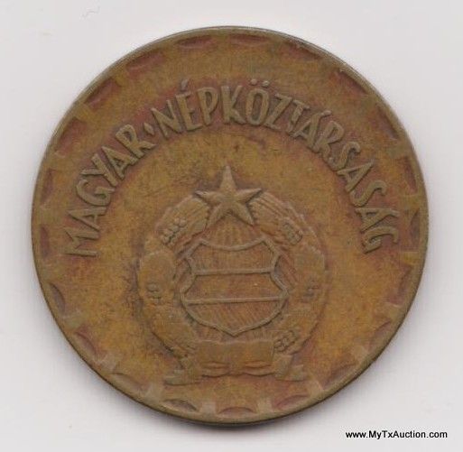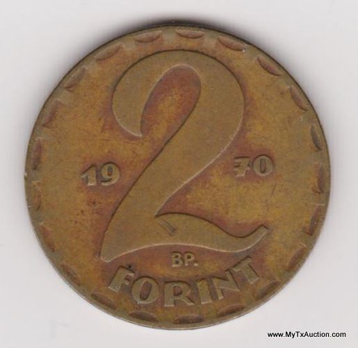 1-1970 2 Forint Country:Hungary - Coin Mint Years:1970-1989 - Metal:Brass - Weight:4.44g - Diameter:22.4mm - Thickness:1.5mm - Design Obverse:Shield on globe with wreath around and star above Lettering: MAGYAR NÉPKÖZTÁRSASÁG - Reverse:Value and date Lettering: 2 FORINT 1970 BP. - Engravers:Unknown - Shape:Round - Edge:Smooth