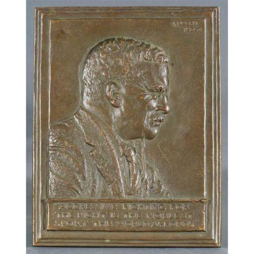 1 JAMES E. FRASER<BR>Theodore Roosevelt<BR>9 3/8"x 12" bas-relief bronze<BR>plaque<BR>dated 1920 <BR>CONDITION REPORT: 3" scratch in background (below chin)<BR>PACKING AND SHIPPING (excluding insurance) by Fairfield Auction to points within the Continental U.S.A. (all other international must be handled by 3rd party shipper) $40.