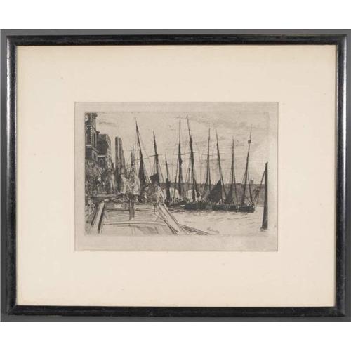 1 JAMES MCNEILL WHISTLER Billingsgate etching 5 7/8"x 8 7/8" with gallery label verso PACKING AND SHIPPING (excluding insurance) by Fairfield Auction to points within the Continental U.S.A. (international must be handled by 3rd party shipper) $40. CONDITION REPORT: excellent.