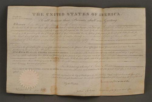 1 JAMES MONROE, land grant signed as president, 10"X16" dated 1822, unframed, packing and shipping $30