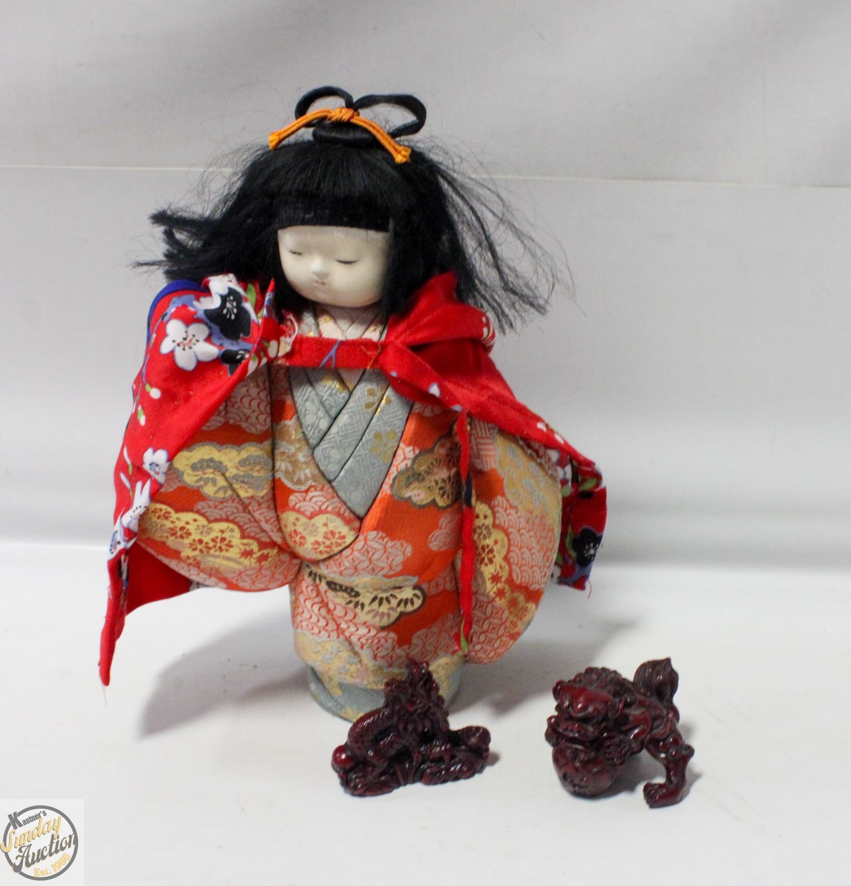 1 JAPANESE DOLL. 1 MINI DRAGON STATUE