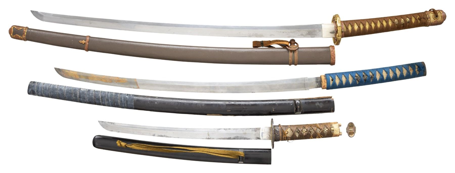 1) KATANA. A nice shin-gunto katana measuring 39 1/2" overall with a 27 1/8" blade. Blade has a slightly wavy hamon and a silvered copper habaki. The nakago has a single mekugi-ana and an 8 character signature on one side and an 11 character signature on the other. The gilded brass tsuba has a classic 4 cherry blossom design on both sides with 2 seppa above and 2 seppa below. matching fuchi and kabuto-gane. Brown tsuka-ito with white same and gilded 3 cherry blossom menuki. Dark olive painted saya with matching gunto. CONDITION. blade has a very nice polish with very minor staining, Tsuka show light wear as does the saya. 2) WAKIZASHI. This wakizachi has a 22 1/4" blade with an irregular hamon and no habaki. The nakago has a single mekugi-ana and is not signed. There is no seppa or tsuba but there is a tsuka with no fuchi but the kashira is present. White same with blue tsuka-ito and twin dog menuki, Black painted wooden saya. CONDITION: blade has staining and some oxidation. What is present of the tsuka shows light wear but it is quite apparent this tsuka does not go with this blade. Saya shows heavy wear with losses and tape residue. 3) WAKIZASHI. This Japanese wakizashi measures 22" overall with a 15 1/8" blade that has a nearly straight hamon. Silvered habaki and a beautiful chiseled iron tsuba with gold and copper inlay of a samurai in battle. There is one seppa above and below the tsuba and the nakago has a single mekugi-ana and no signiture. The tsuka is very worn but has matching fuchi and kashira with white same and tan tsuka-ito. The menuki show a gold inlayed on copper samurai warrior. Black enameled saya. CONDITION: blade is nice but needs a professional polish. Tsuka shows extensive wear but is complete. Saya shows light wear but is missing a kogatana. (02-24442-1/BF). $800-1200.