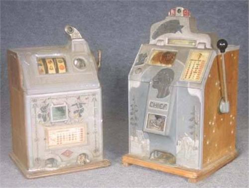 1 JENNINGS CHEIF 10 CENT CLOT MACHINE with original paint decoration. locked back, needs restoration