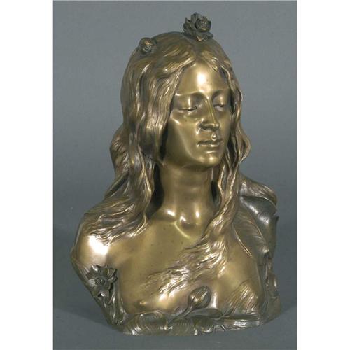 1 LEOPOLD SAVINE Bronze Bust of Ophelia 13" high circa 1900 PACKING AND SHIPPING (excluding insurance) by Fairfield Auction to points within the Continental U.S.A. (international must be handled by 3rd party shipper) $40. CONDITION REPORT: excellent